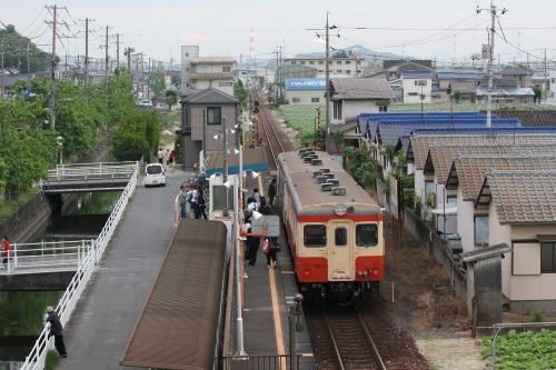 090600-20-6.jpg先日撮影した、浦田駅停車中の水島臨海鉄道下りキハ20です。夕方たくさんの通勤通学のお客さんを乗せて走ります。この辺りは数少ない高架でない部分で民家の軒先をぬけたり、畑の真ん中を走ったりと趣のある区間です。遠くに水島工業地帯の煙突が見えます。