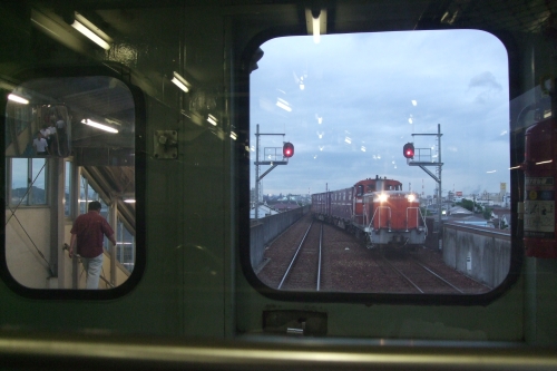 090600-20-3.jpg先日水島臨海鉄道キハ20に乗車した際、車内から撮影したすれ違いの貨物列車です。レトロな車両の窓から見えるレトロな風景です。高架区間でなければさらに雰囲気が盛り上がるのですが・・・。